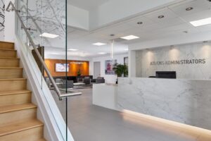 One of the project goals, since the company serves both public and private clients, was to create an elegant office space without being too conspicuous. A neutral color palette was utilized to create a warm, timeless design with color accents to achieve a calm harmonious work environment.