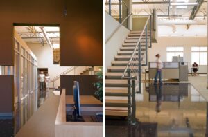Navajo Company, an advertising and public relations firm serving the growing Silicon Valley high-tech industry, wanted an environment to reflect who they are—a space that is both high-tech, yet warm and inviting. Along with exposed structure, mechanical ducts and lighting, the lobby is enclosed by a sweeping curved wall cut with a narrow slot which provides a glimpse of the room that lies just ahead. The opening reveals the main conference room beyond. On axis to the entry, the view is down an angled wall of offices, with stairs to a new mezzanine beyond. From the conference rooms, selective views out reveal open office furniture and the company’s sign in the entry area beyond. The stainless steel stair with wood treads leads to the mezzanine offices.