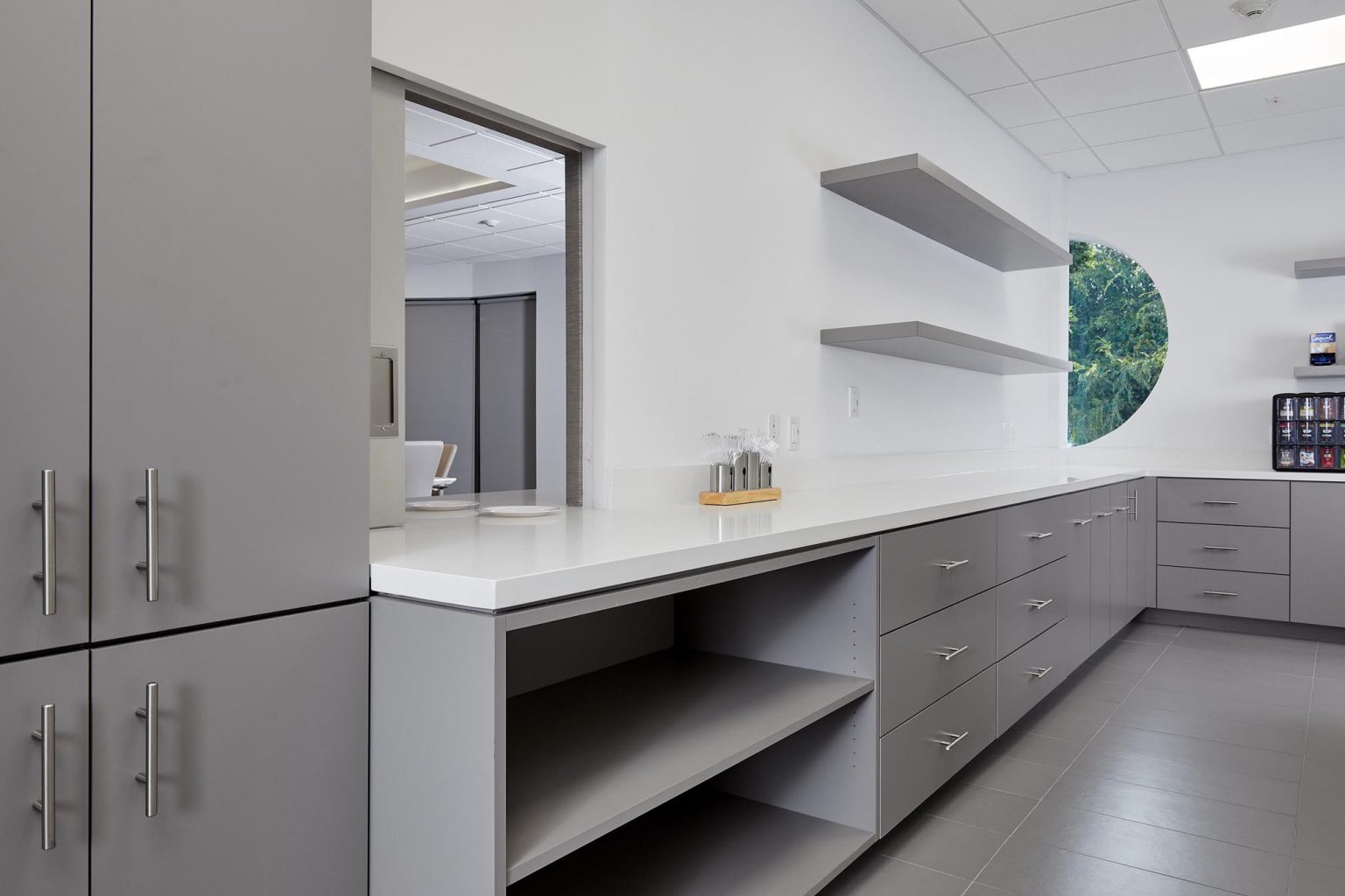 Small improvements to the entry and exterior signage work with the existing building’s strong exterior geometry adding some wood and metal signage and illuminated identity graphics. Though the building is not that old, there are still challenges to providing an accessible and energy efficient work environment. Constant upgrades to allow full accessibility and ingress egress compliance starting with bathrooms and break room public area improvements have been completed.
